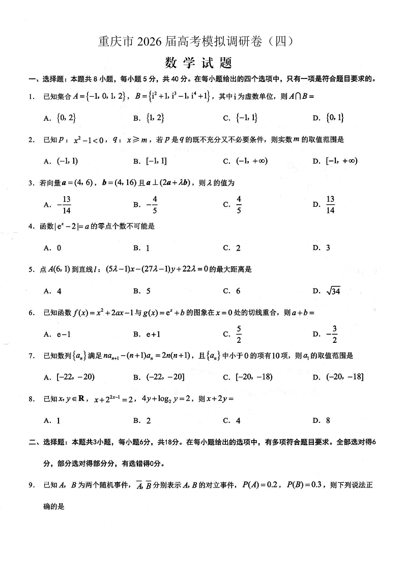 重庆市2026年普通高等学校招生全国统一考试康德调研(四)数学试题(含答案).pdf