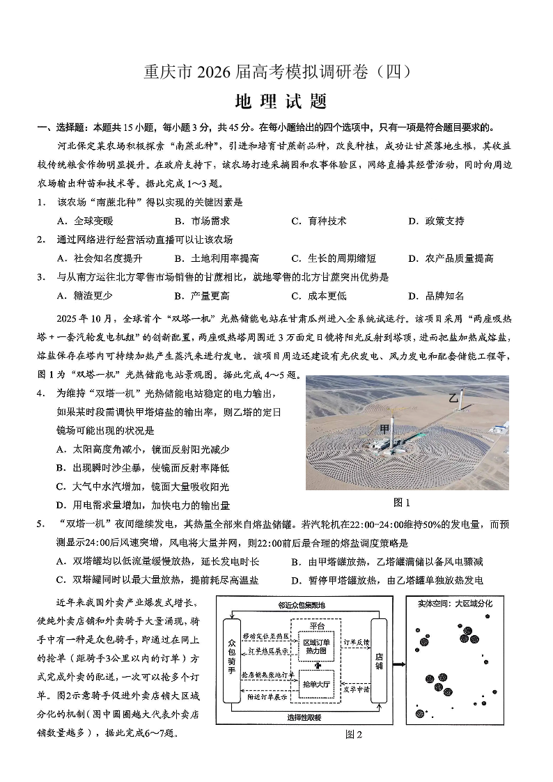 重庆市2026年普通高等学校招生全国统一考试康德调研(四)地理试题(含答案).pdf