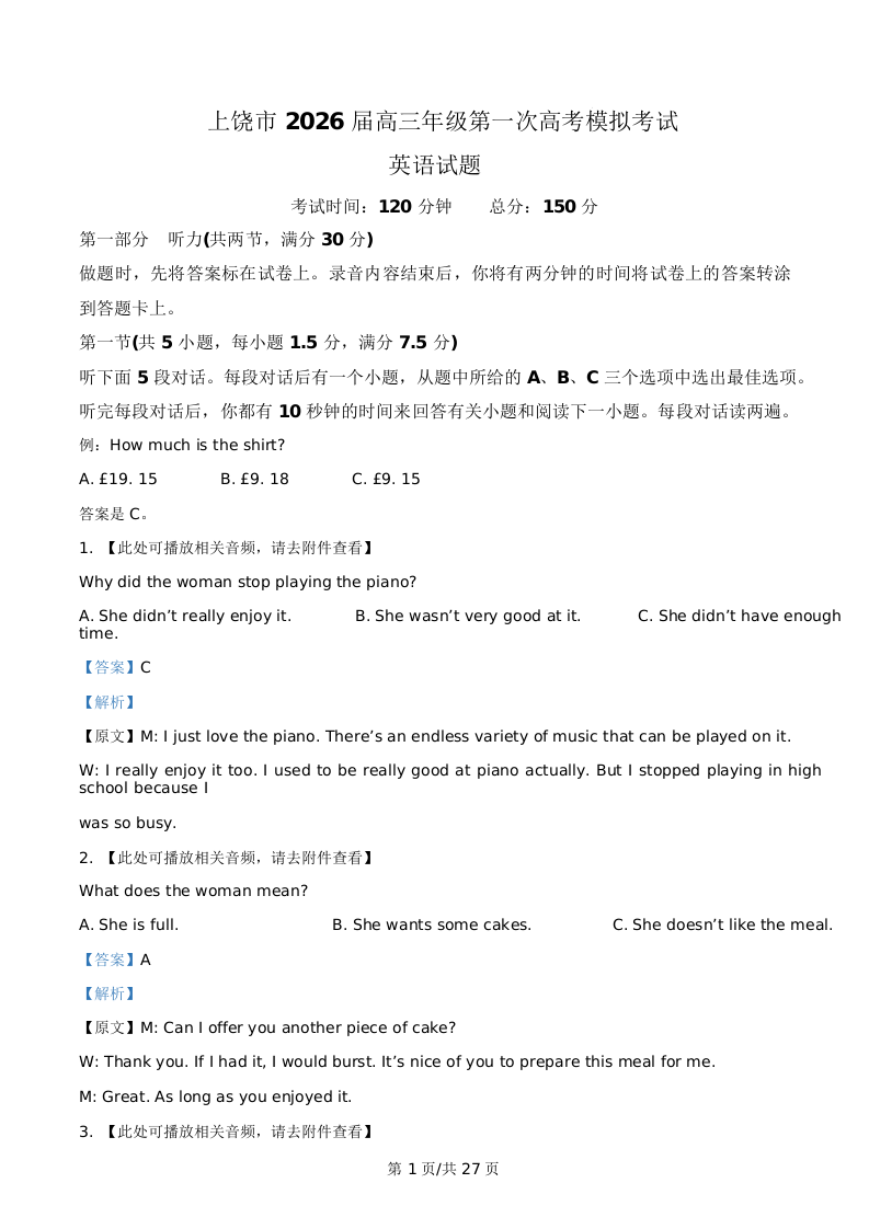 上饶市2026届高三年级第一次高考模拟考试 英语答案.docx
