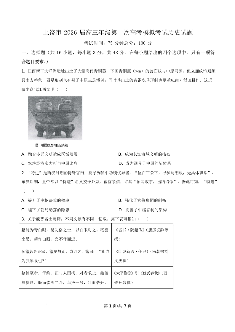上饶市2026届高三年级第一次高考模拟考试 历史.docx