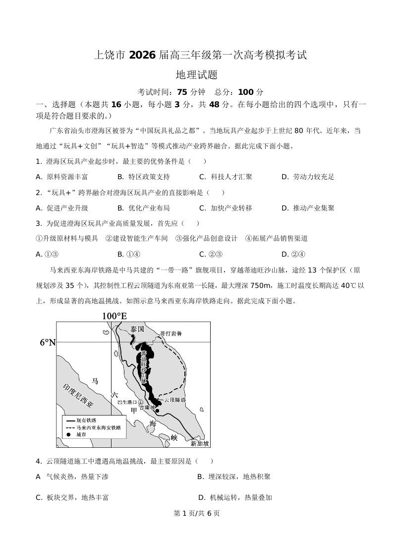 上饶市2026届高三年级第一次高考模拟考试 地理.docx