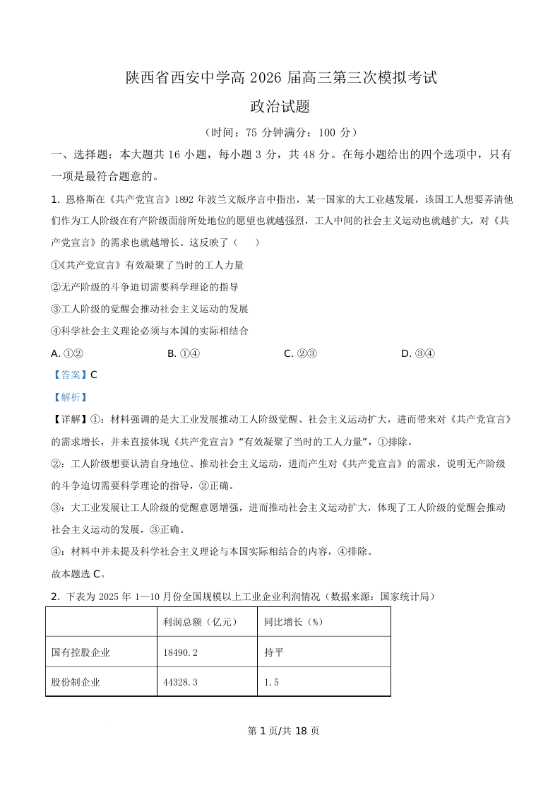 陕西省西安中学高2026届高三第三次模拟考试 政治答案.docx