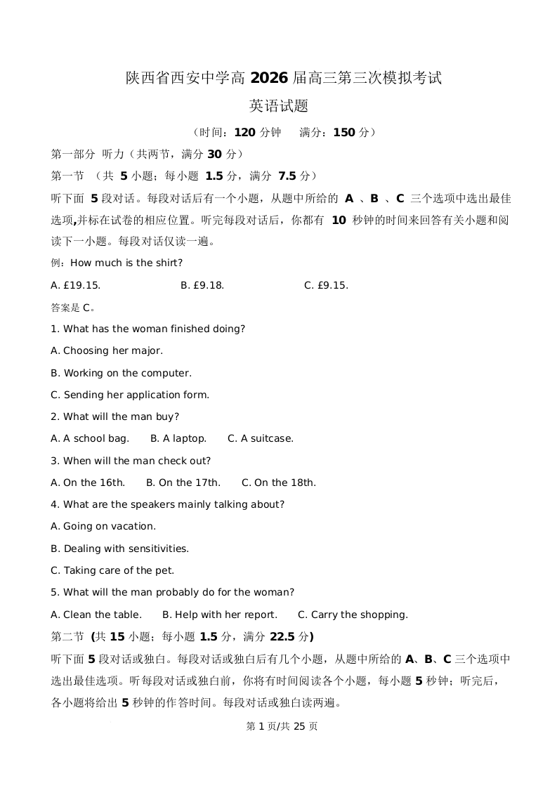 陕西省西安中学高2026届高三第三次模拟考试 英语答案.docx