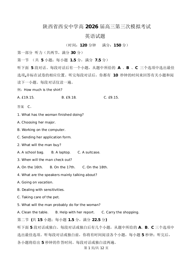 陕西省西安中学高2026届高三第三次模拟考试 英语.docx