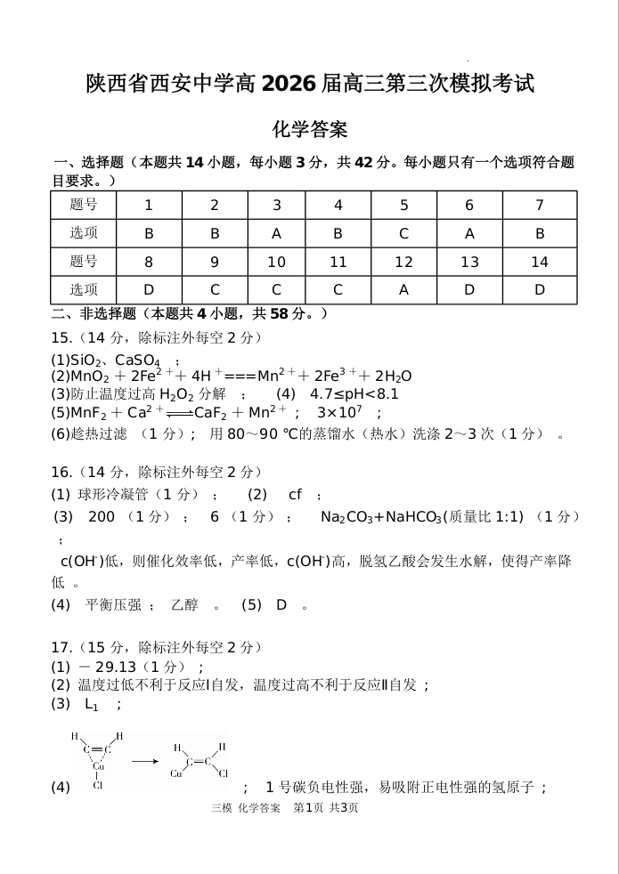 陕西省西安中学高2026届高三第三次模拟考试 化学答案.docx