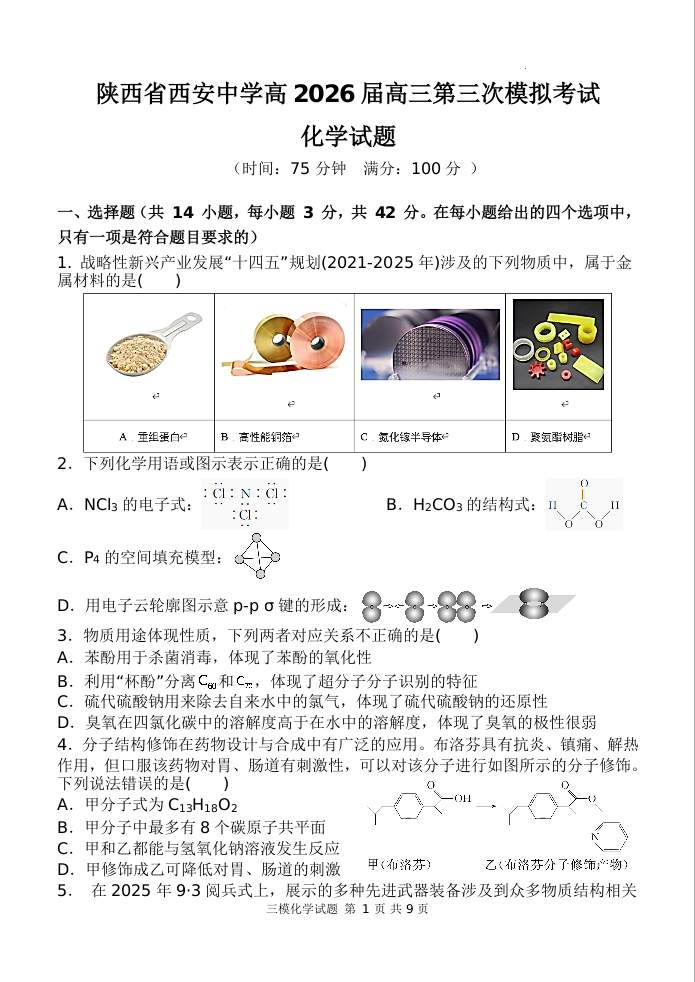 陕西省西安中学高2026届高三第三次模拟考试 化学.docx