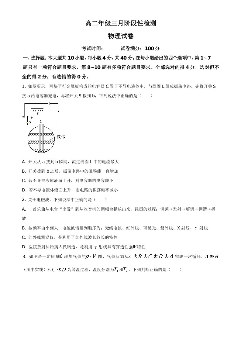 武昌实验中学2025-2026学年高二年级三月阶段性检测 物理.docx