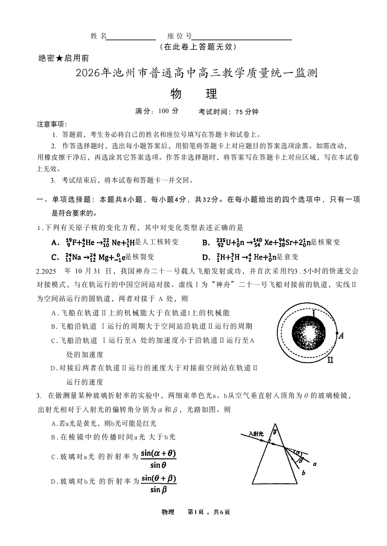 安徽省池州市2026年普通高中高三教学质量统一监测 物理.pdf