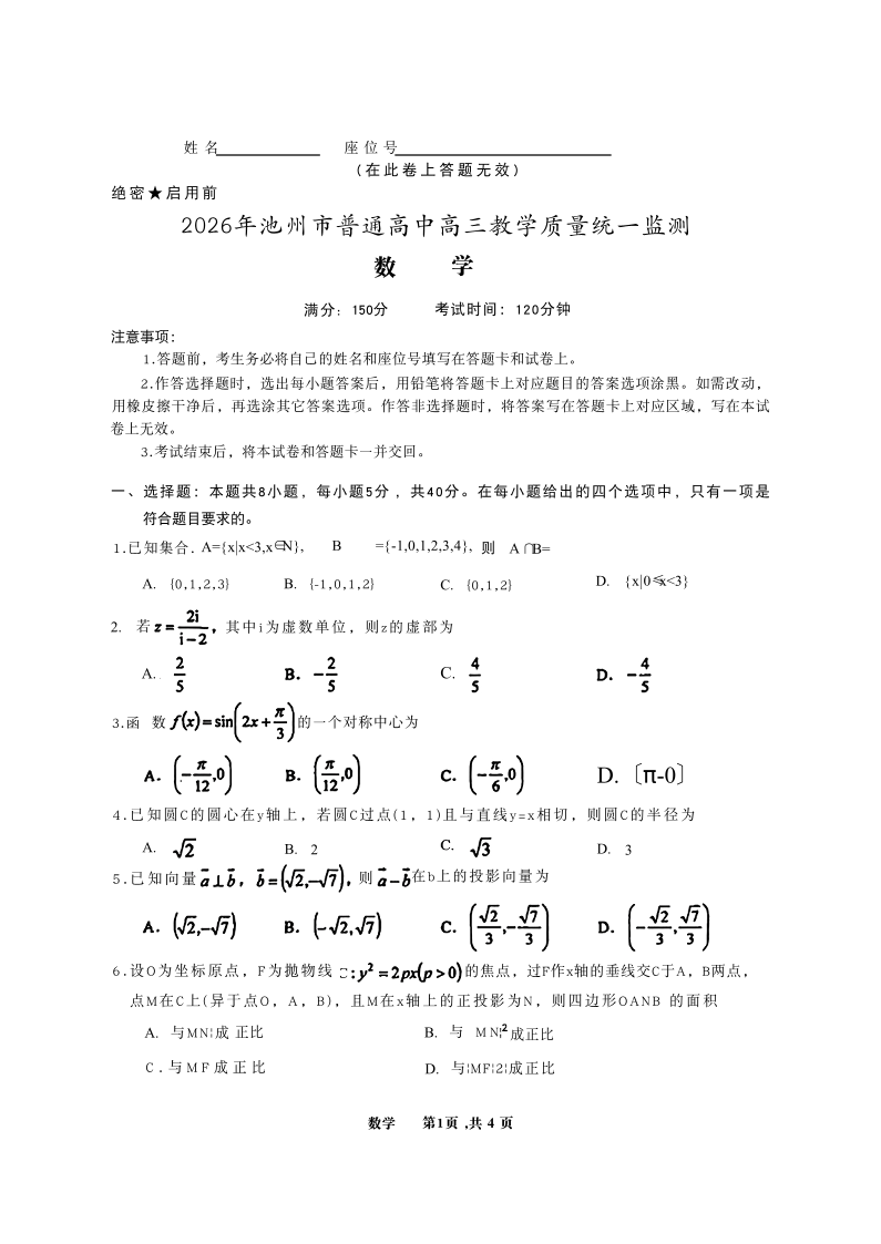 安徽省池州市2026年普通高中高三教学质量统一监测 数学.pdf