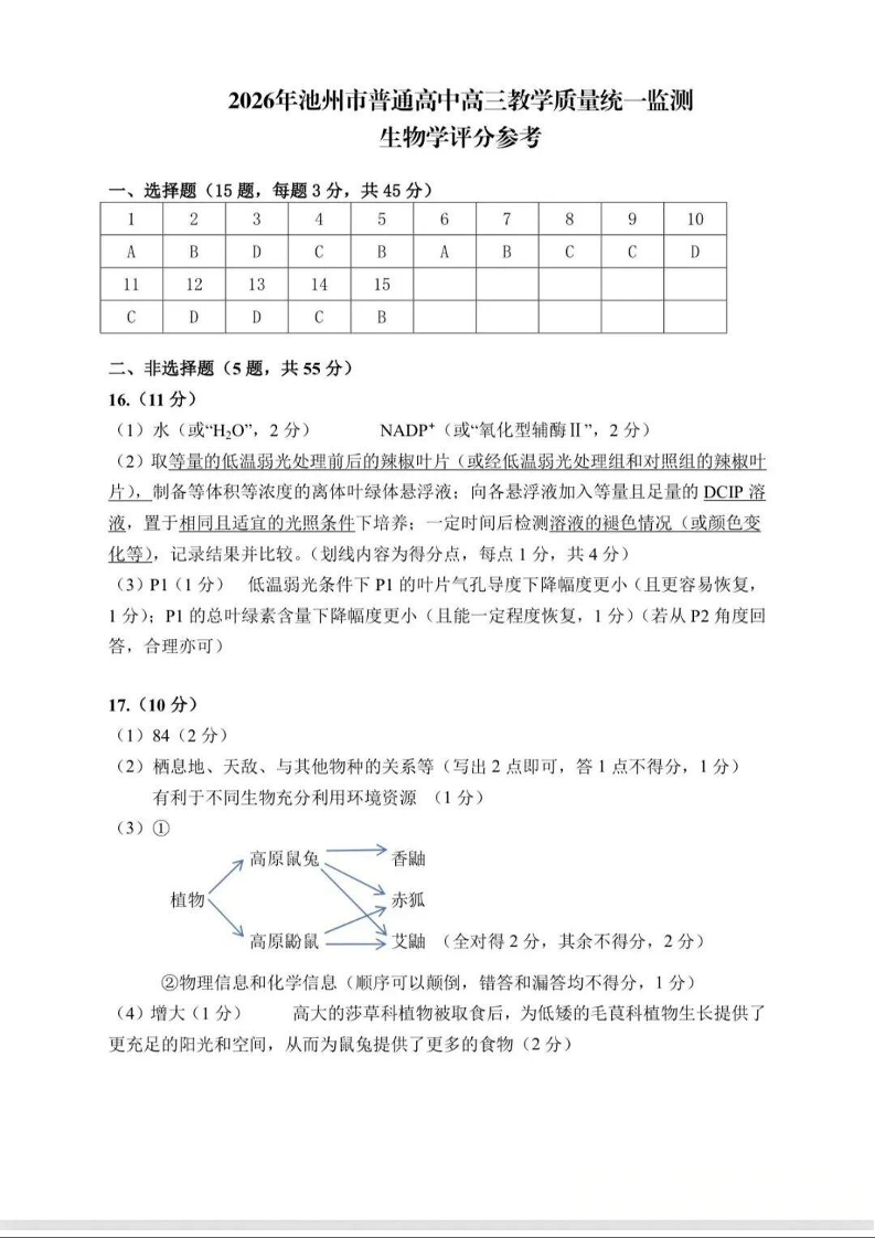 安徽省池州市2026年普通高中高三教学质量统一监测 生物答案.docx