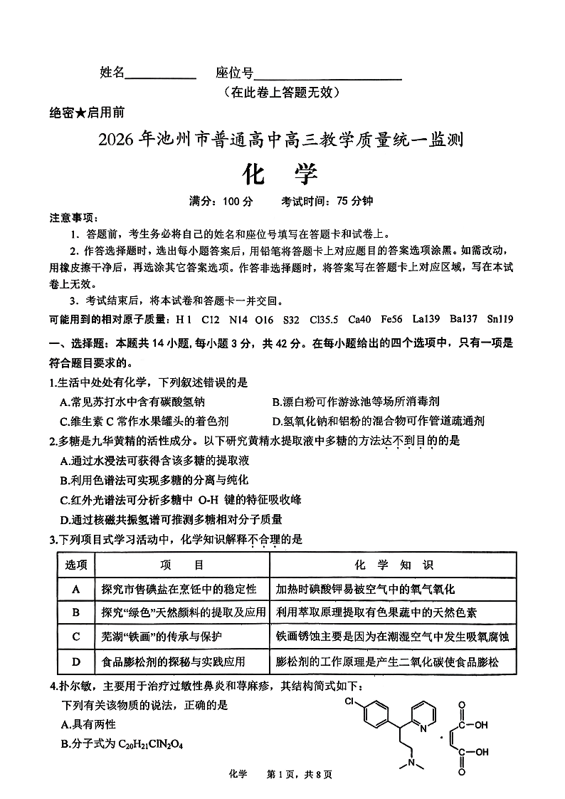 安徽省池州市2026年普通高中高三教学质量统一监测 化学.pdf