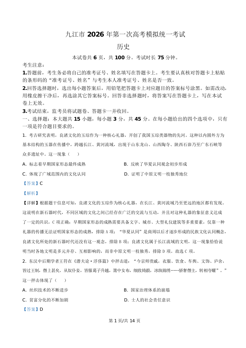 江西省九江市2026届高三第一次高考模拟统一考试 历史答案.docx
