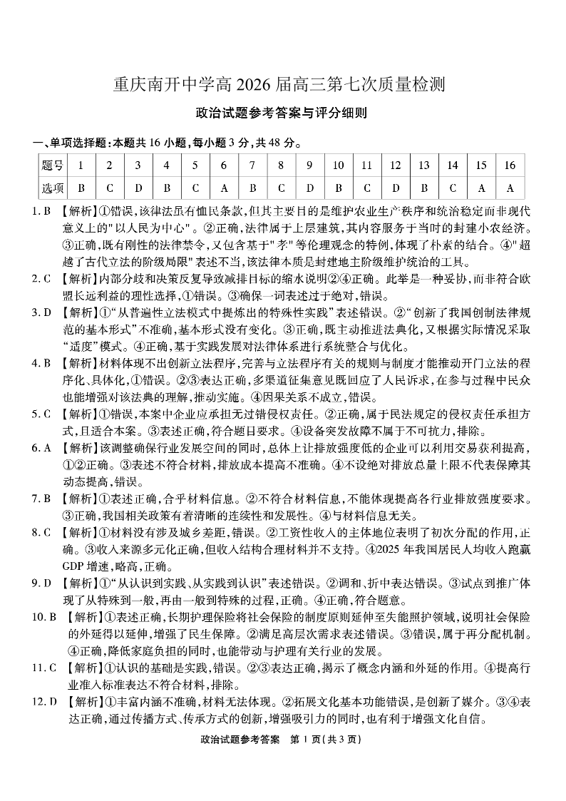 重庆市南开中学高2026届高三第七次质量检测 政治答案.pdf