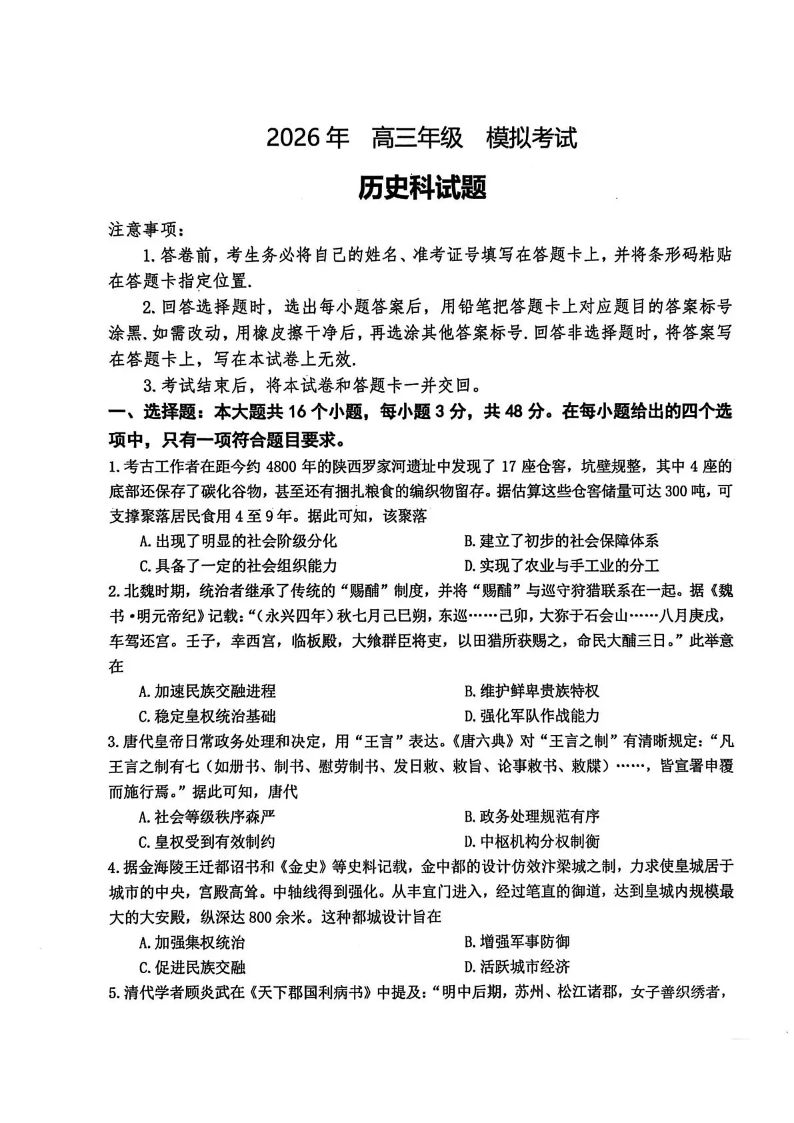 东北三省三校2026届高三下学期第二次模拟考试 历史.pdf