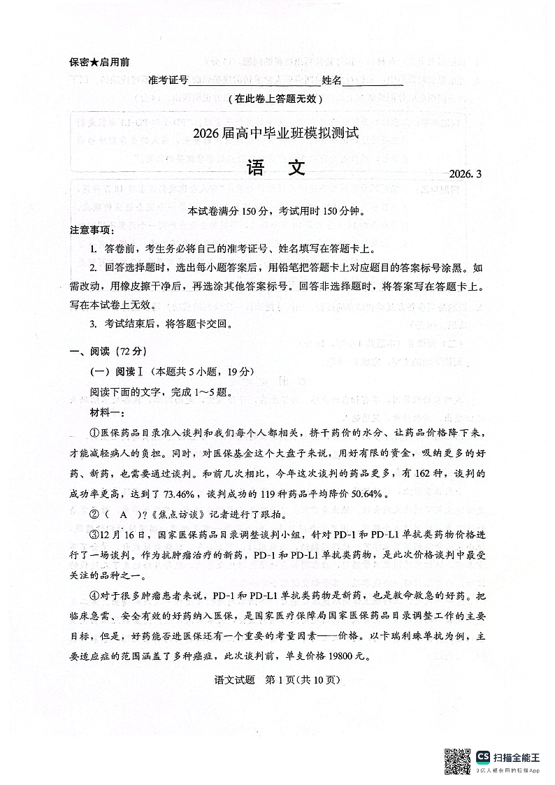 厦门市2026届高中毕业班模拟测试 语文.pdf