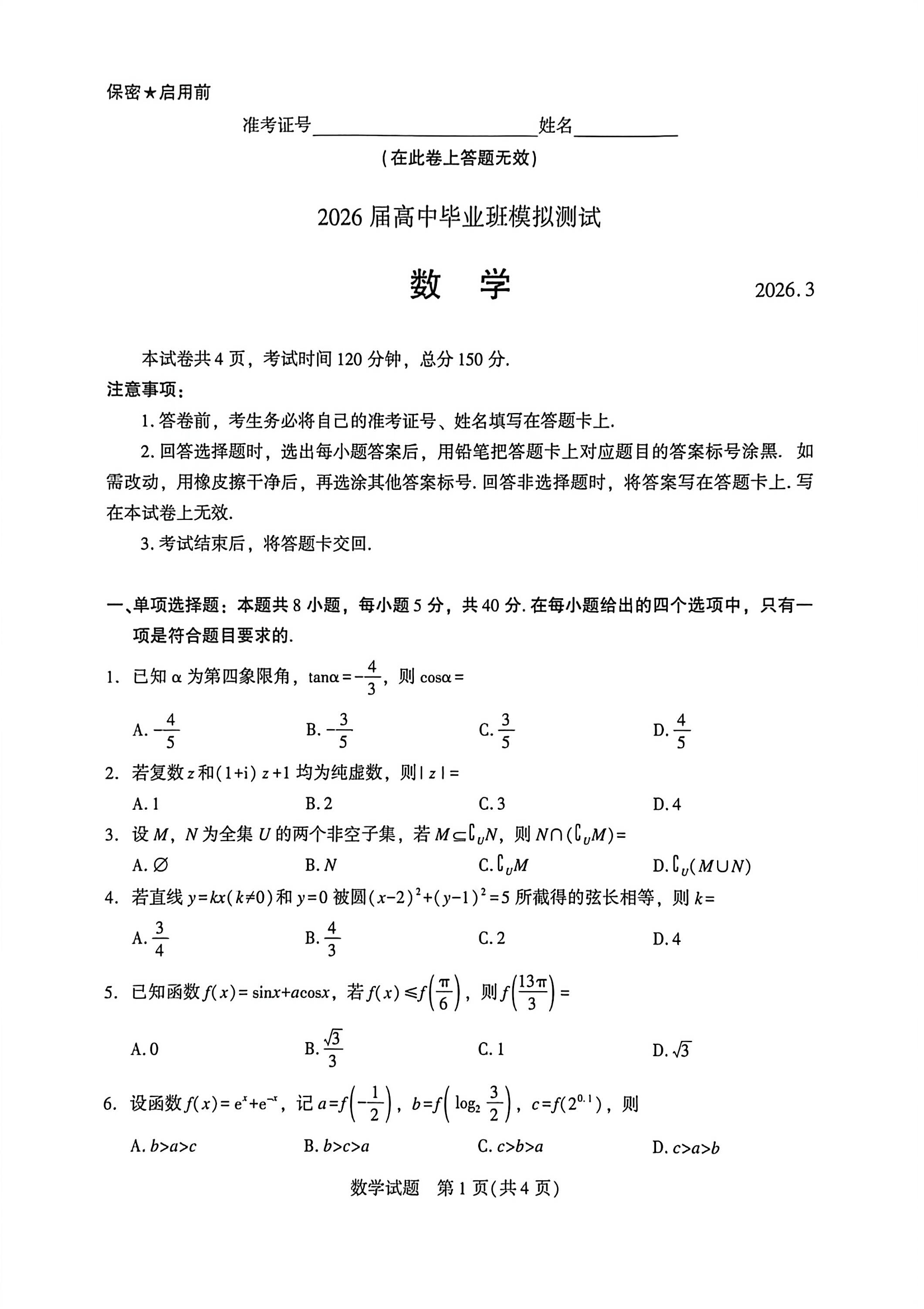 厦门市2026届高中毕业班模拟测试 数学.pdf