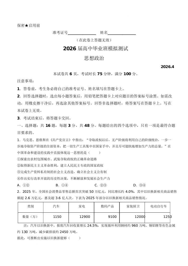 厦门市2026届高中毕业班模拟测试 政治.docx