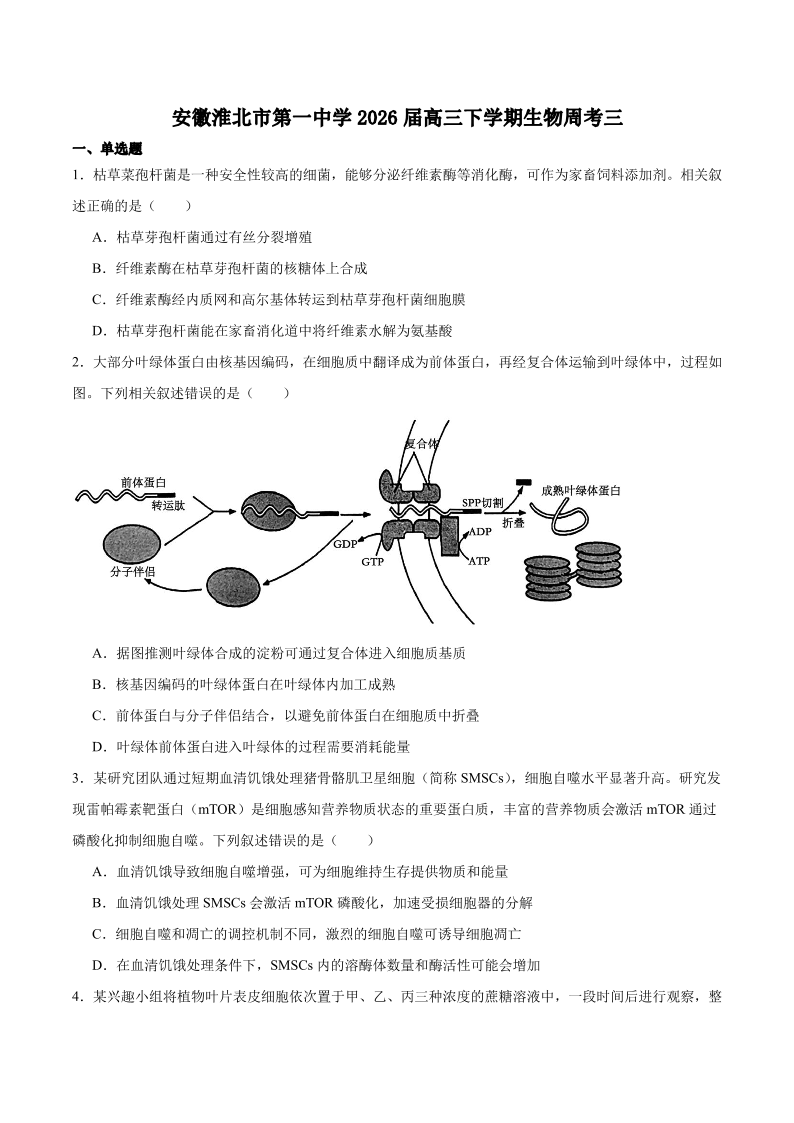 安徽省淮北市第一中学2026届高三下学期周考(三)生物试题(含答案).pdf