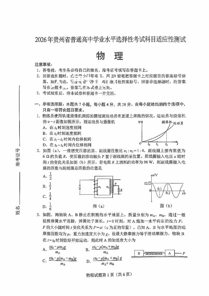 2026年贵州省普通高中学业水平选择性考试科目适应性测试 物理.pdf
