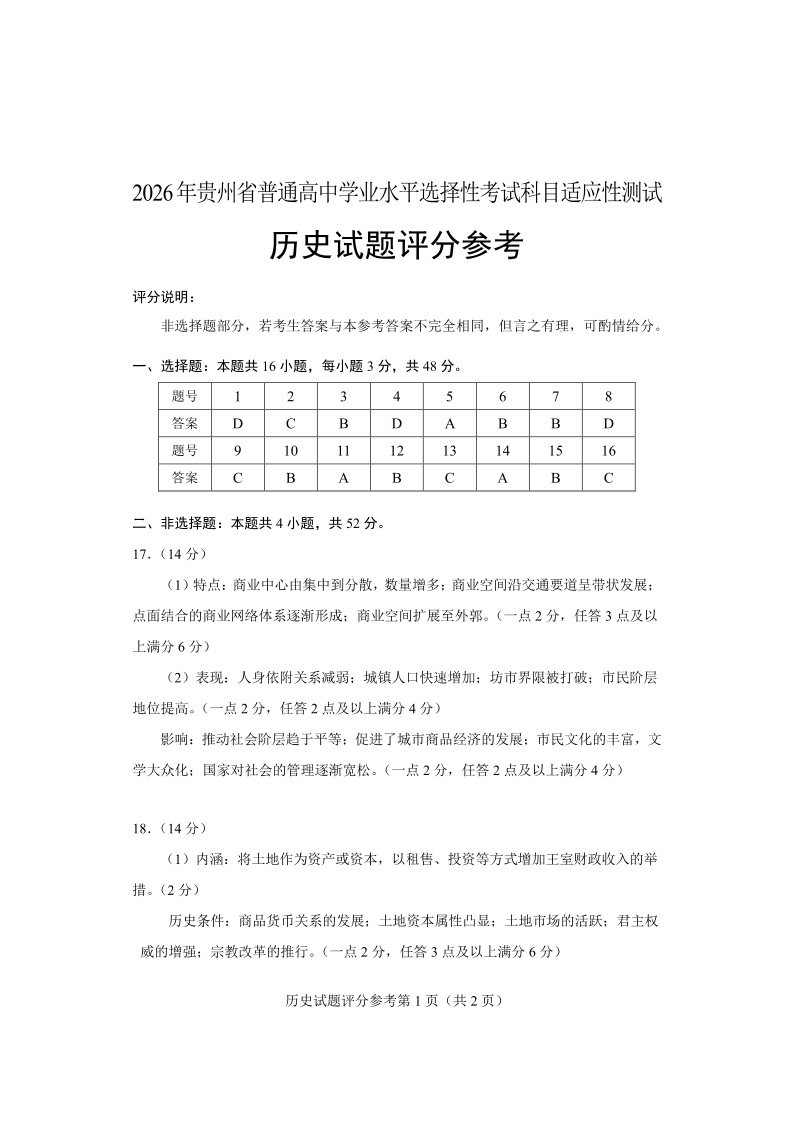 2026年贵州省普通高中学业水平选择性考试科目适应性测试 历史答案.pdf