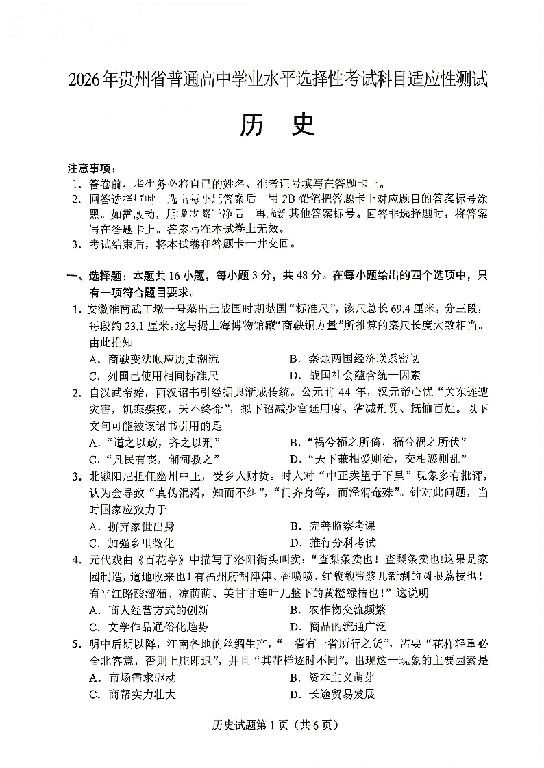 2026年贵州省普通高中学业水平选择性考试科目适应性测试 历史.pdf