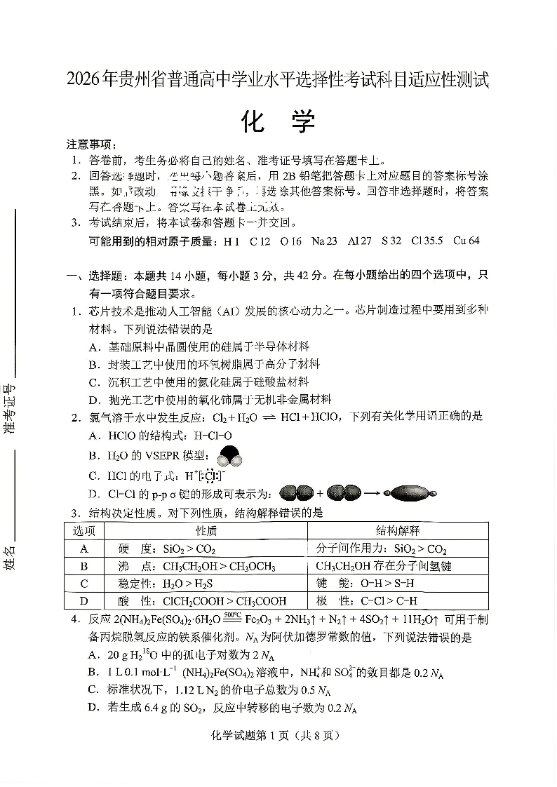 2026年贵州省普通高中学业水平选择性考试科目适应性测试 化学.pdf
