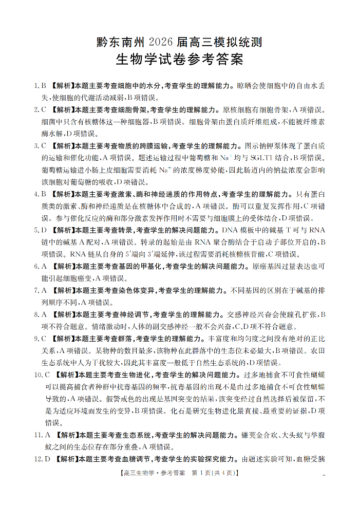 贵州省黔东南州2026届高三下学期模拟统测 生物答案.pdf