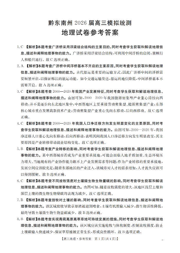 贵州省黔东南州2026届高三下学期模拟统测 地理答案.pdf
