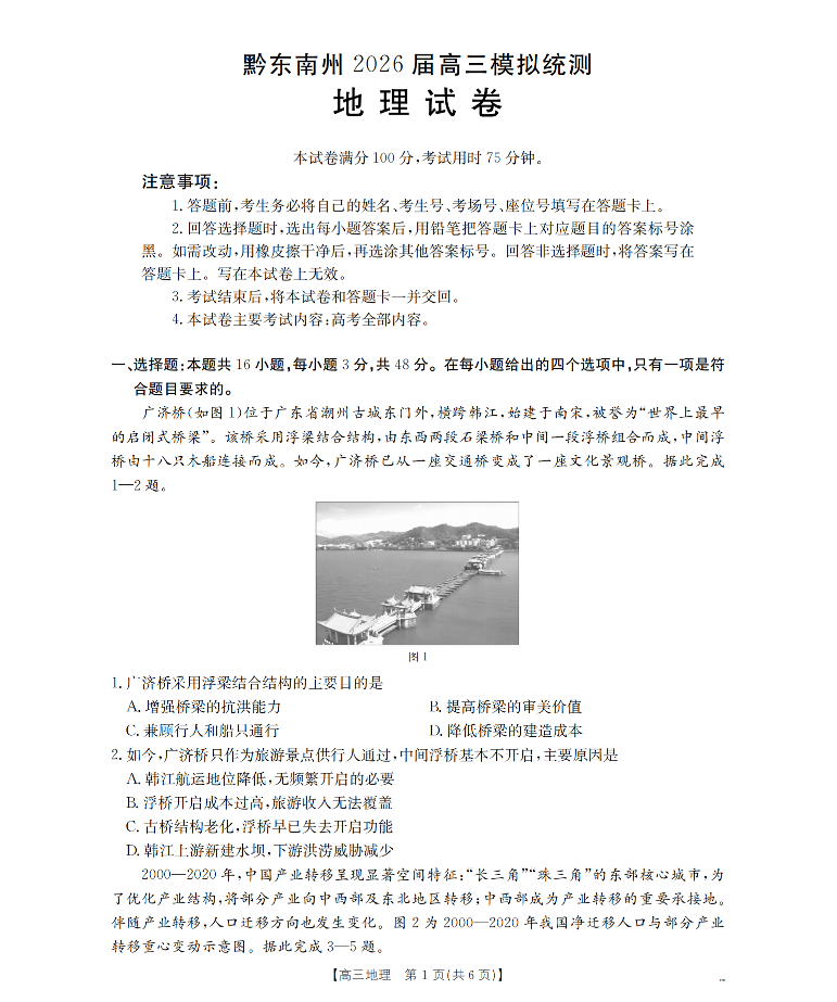 贵州省黔东南州2026届高三下学期模拟统测 地理.pdf