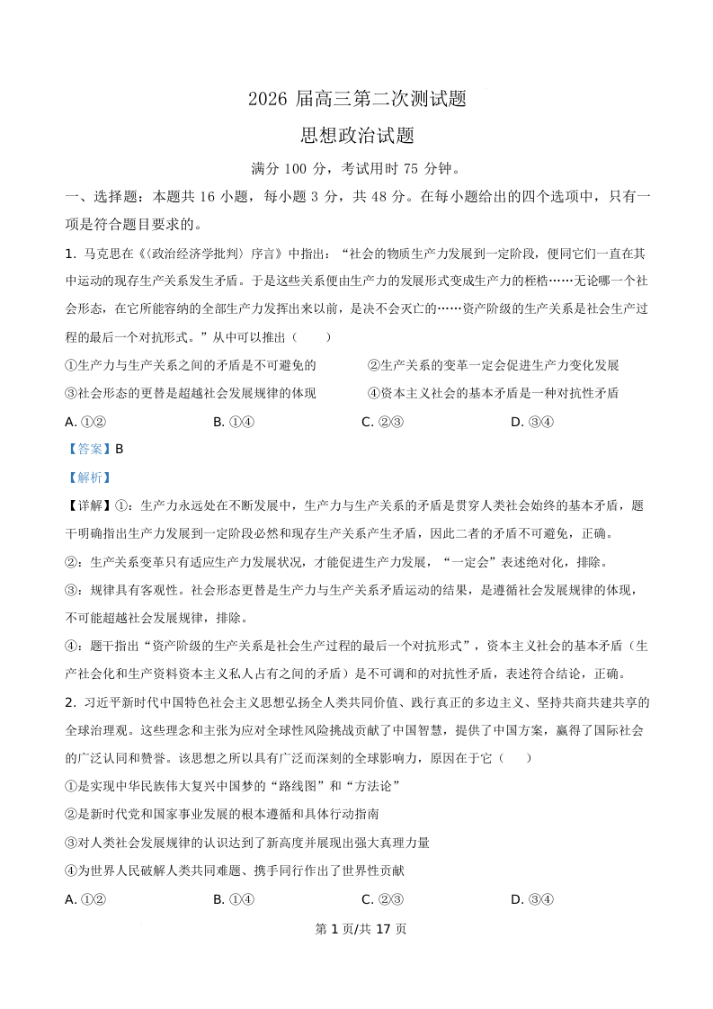 渤海大学附属高级中学2026届高三下学期第二次模拟预测 政治答案.docx