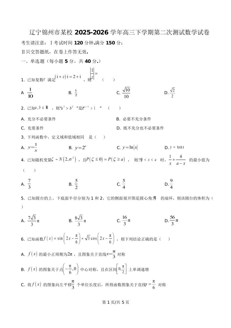 渤海大学附属高级中学2026届高三下学期第二次模拟预测 数学.docx