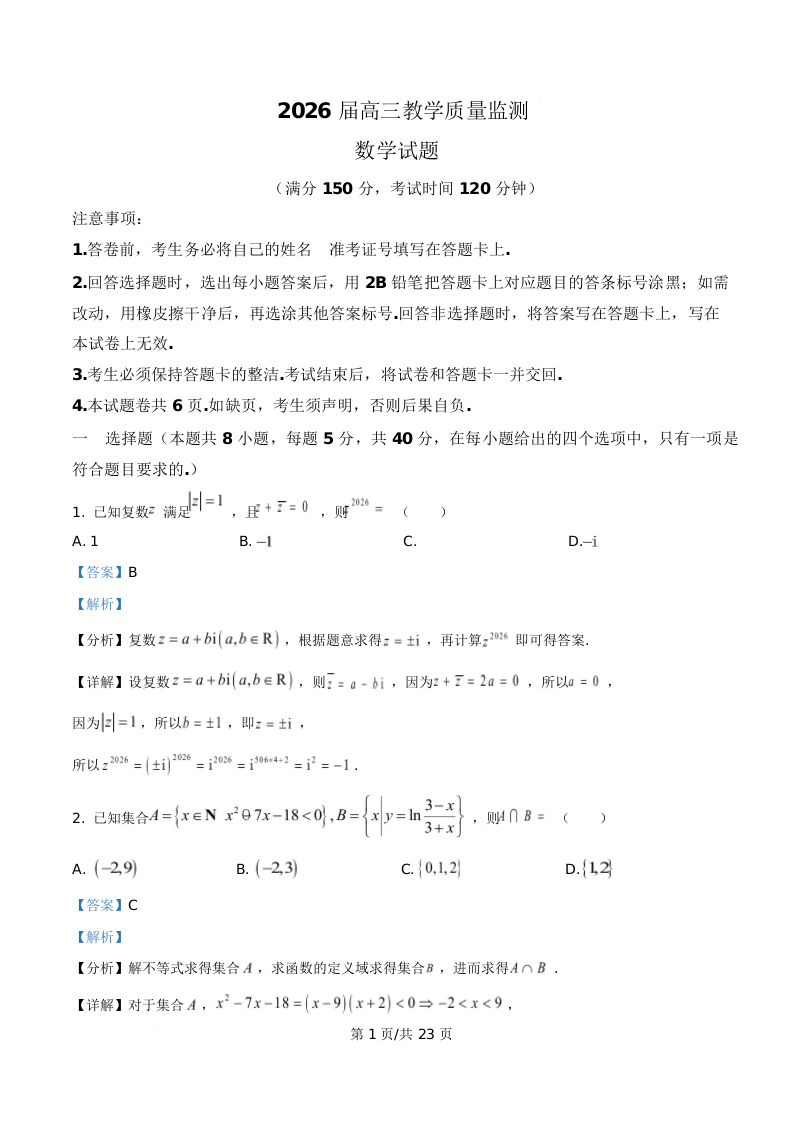 湖南省郴州市2026届高三下学期3月教学质量监测 数学答案.docx