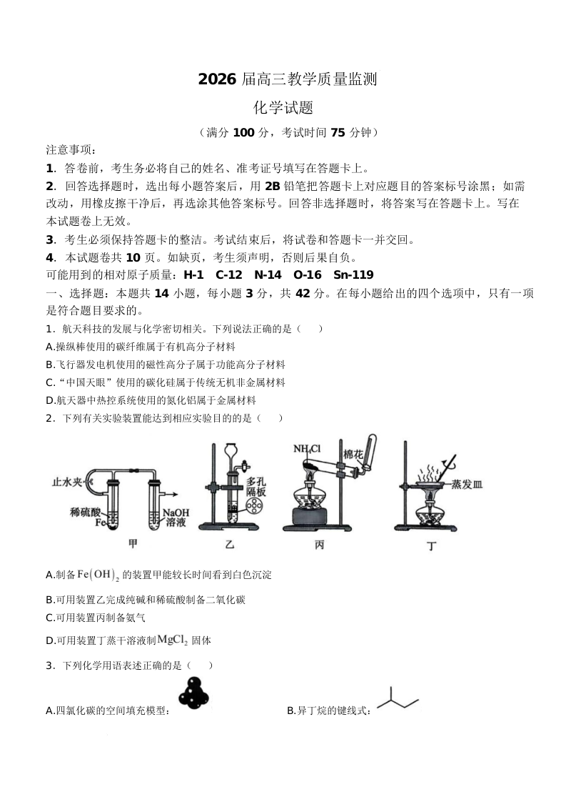 湖南省郴州市2026届高三下学期3月教学质量监测 化学.docx