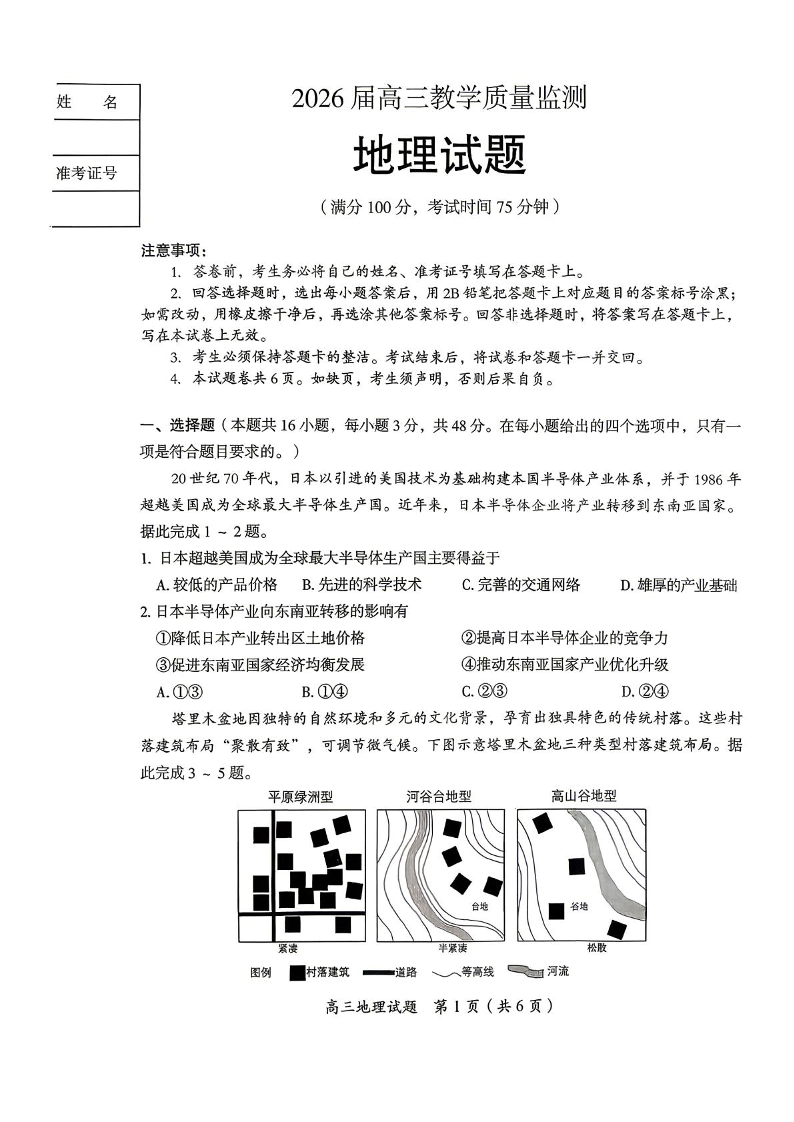 湖南省郴州市2026届高三下学期3月教学质量监测 地理.pdf
