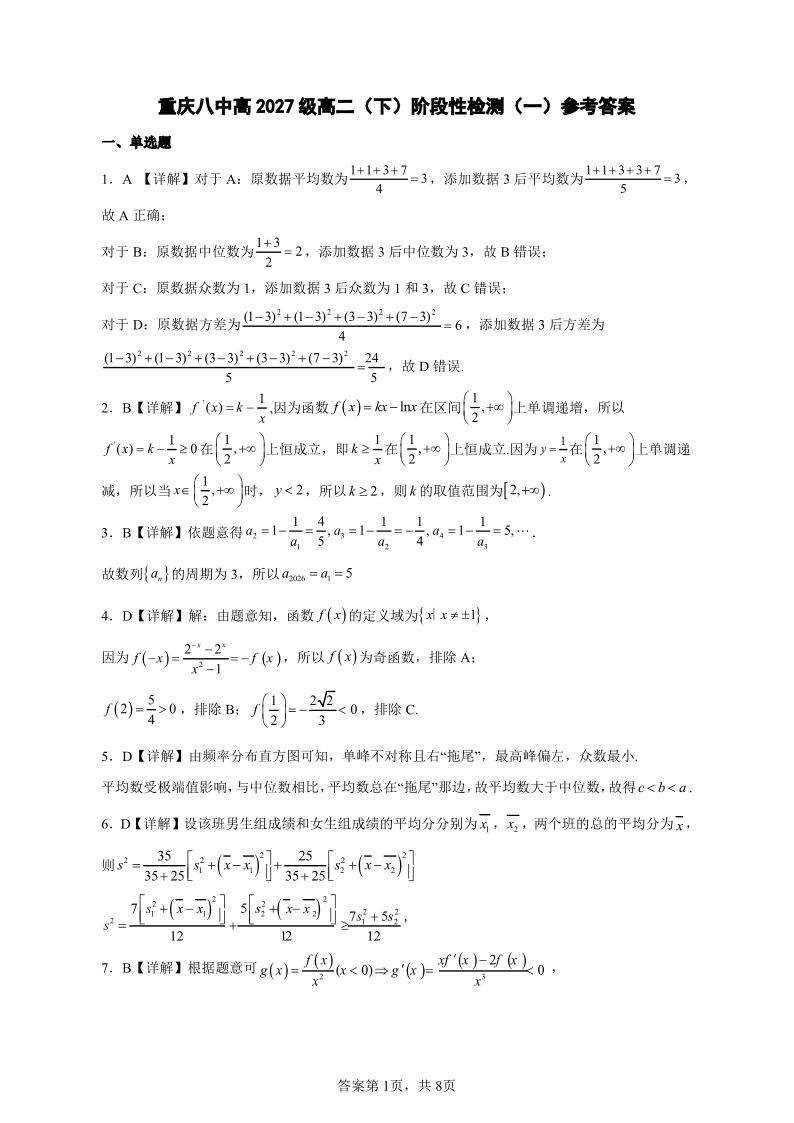 重庆八中高2027级高二(下)阶段性检测(一) 数学答案.pdf