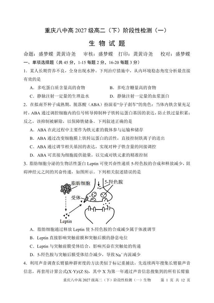 重庆八中高2027级高二(下)阶段性检测(一) 生物.pdf