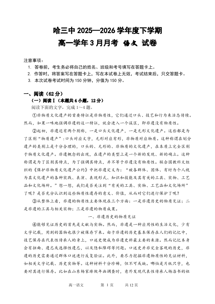 哈尔滨市第三中学2025-2026学年度下学期高一学年三月月考 语文.pdf