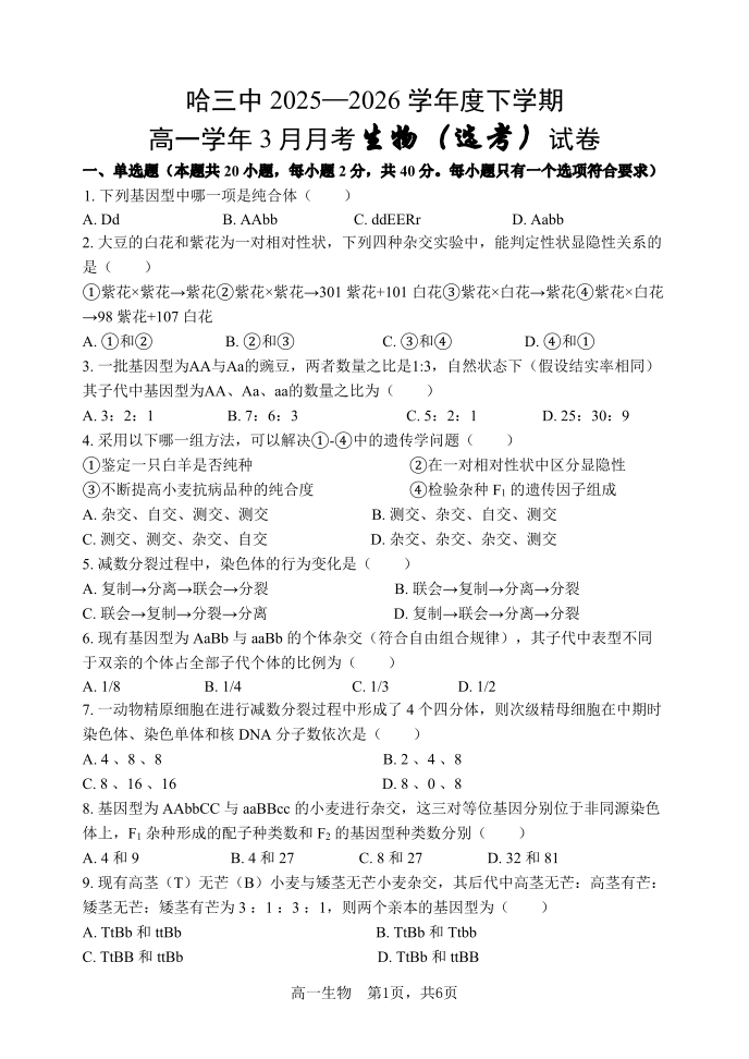 哈尔滨市第三中学2025-2026学年度下学期高一学年三月月考 生物.pdf