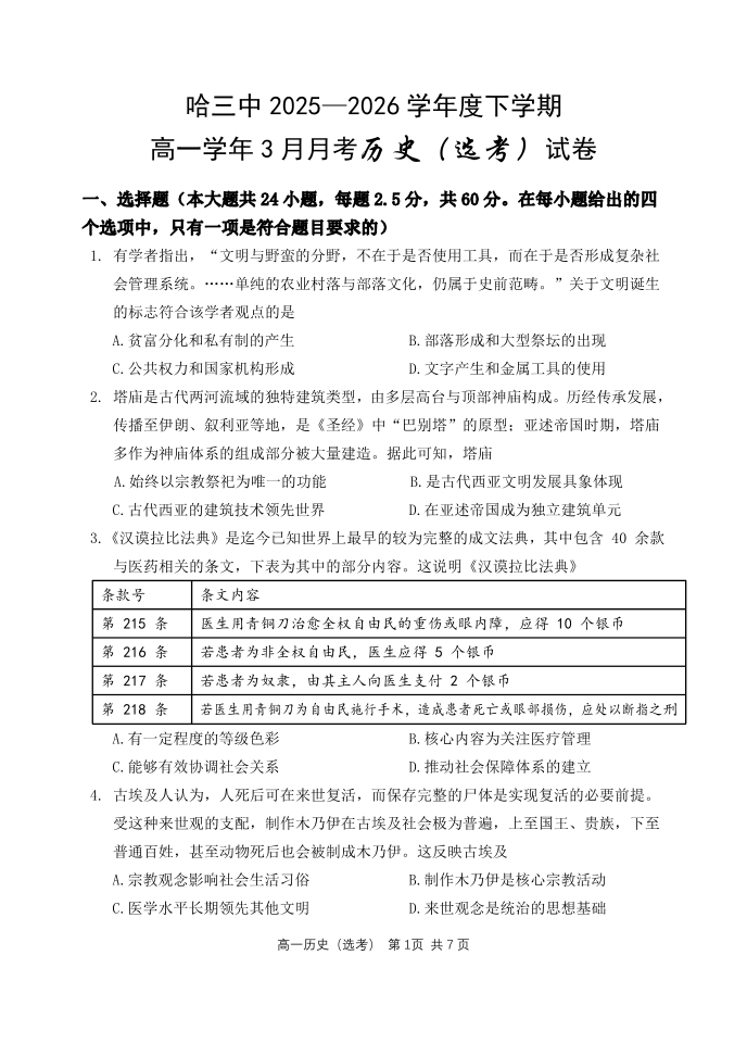 哈尔滨市第三中学2025-2026学年度下学期高一学年三月月考 历史.pdf