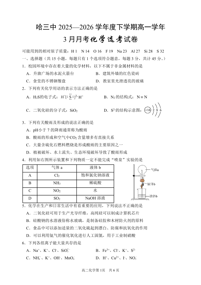 哈尔滨市第三中学2025-2026学年度下学期高一学年三月月考 化学.pdf