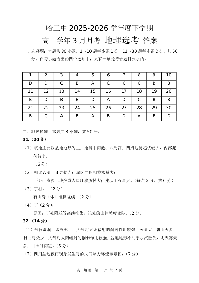 哈尔滨市第三中学2025-2026学年度下学期高一学年三月月考 地理答案.docx