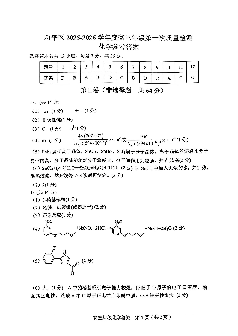 和平区2025-2026学年度高三年级第一次质量检测 化学答案.pdf