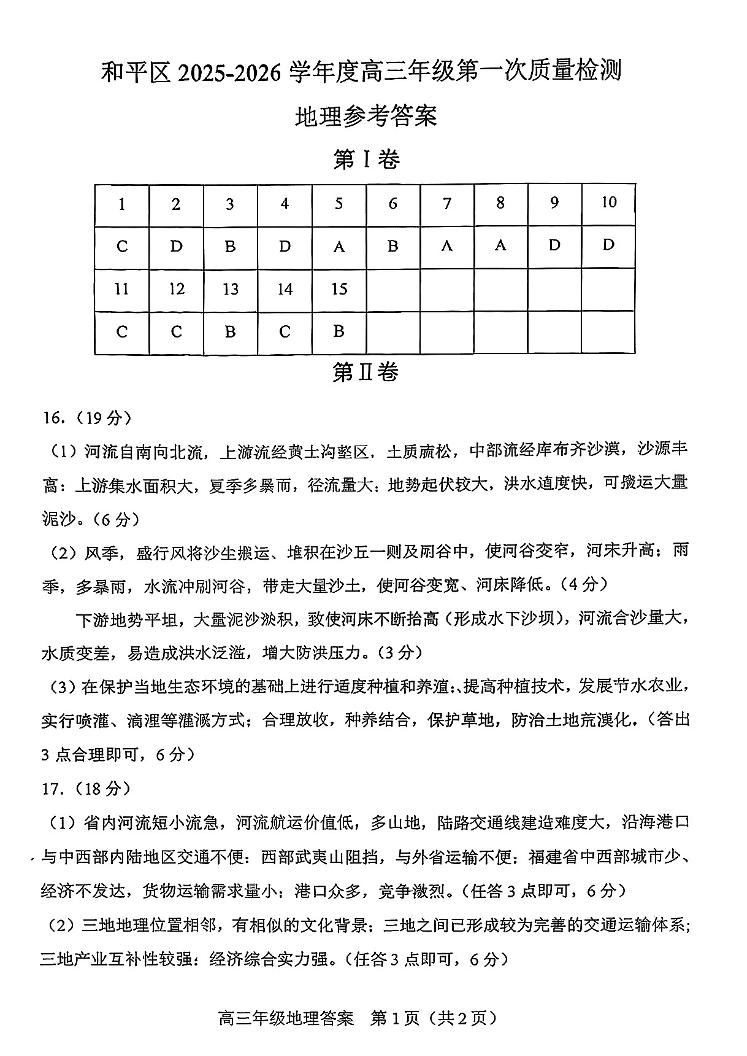 和平区2025-2026学年度高三年级第一次质量检测 地理答案.pdf