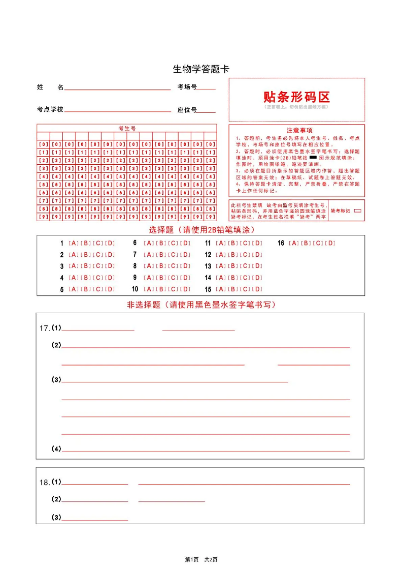 河南省2026届高三下学期高考适应性考试 生物答题卡.pdf