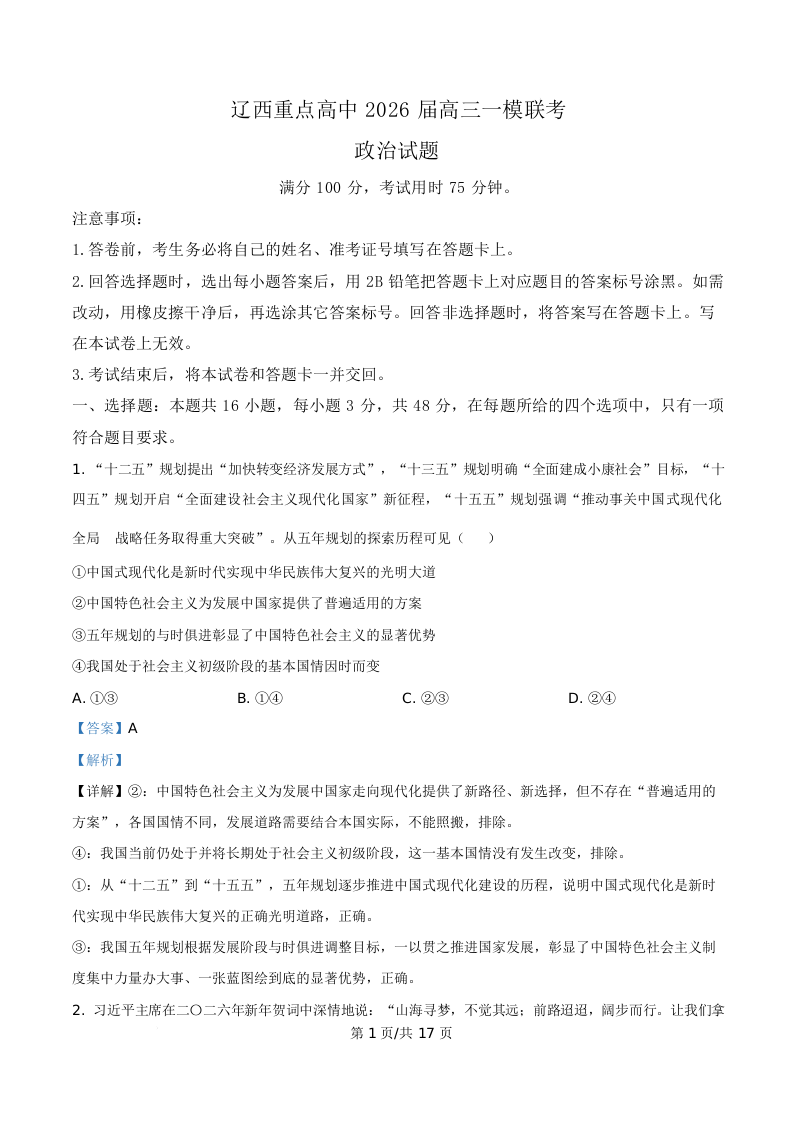 辽西重点高中2026届高三一模联考 政治答案.docx