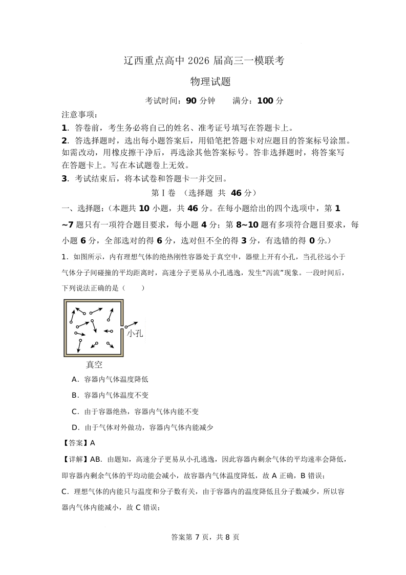 辽西重点高中2026届高三一模联考 物理答案.docx