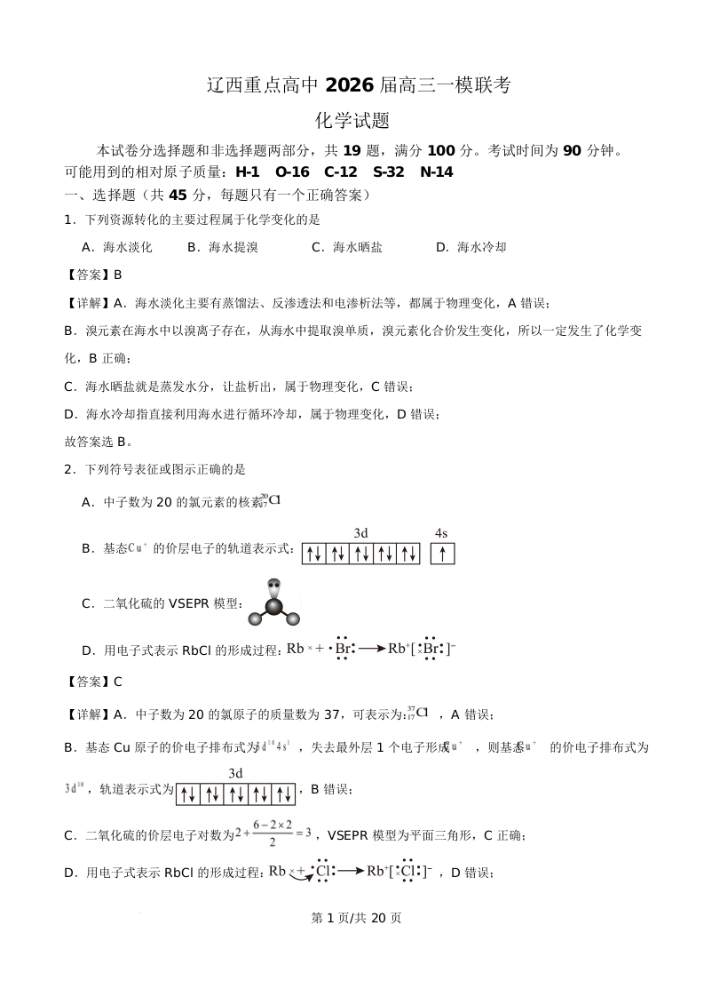 辽西重点高中2026届高三一模联考 化学答案.docx