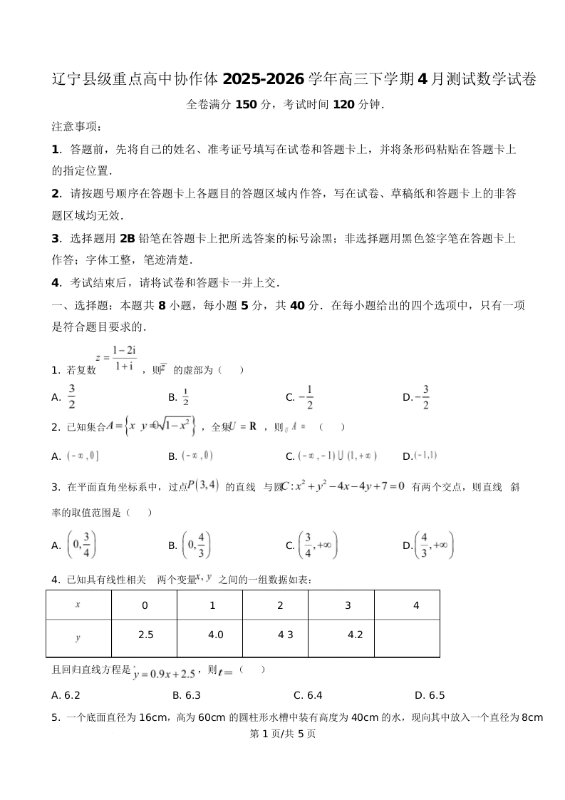 辽宁省县级重点高中协作体2026届高三下学期4月测试 数学.docx