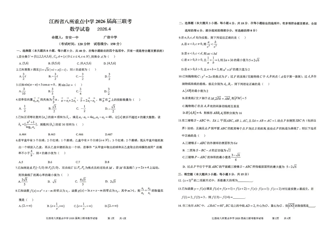 江西省八所重点中学2026届高三联考 数学.pdf