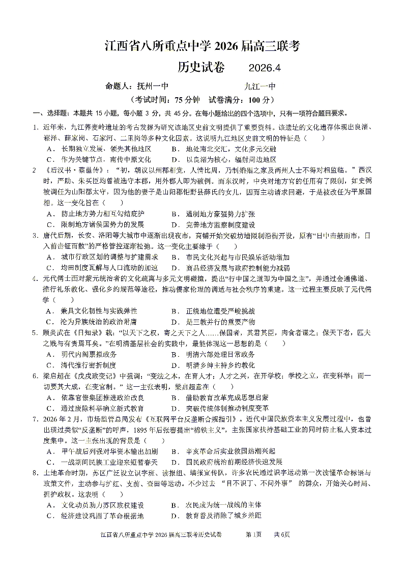 江西省八所重点中学2026届高三联考 历史.pdf